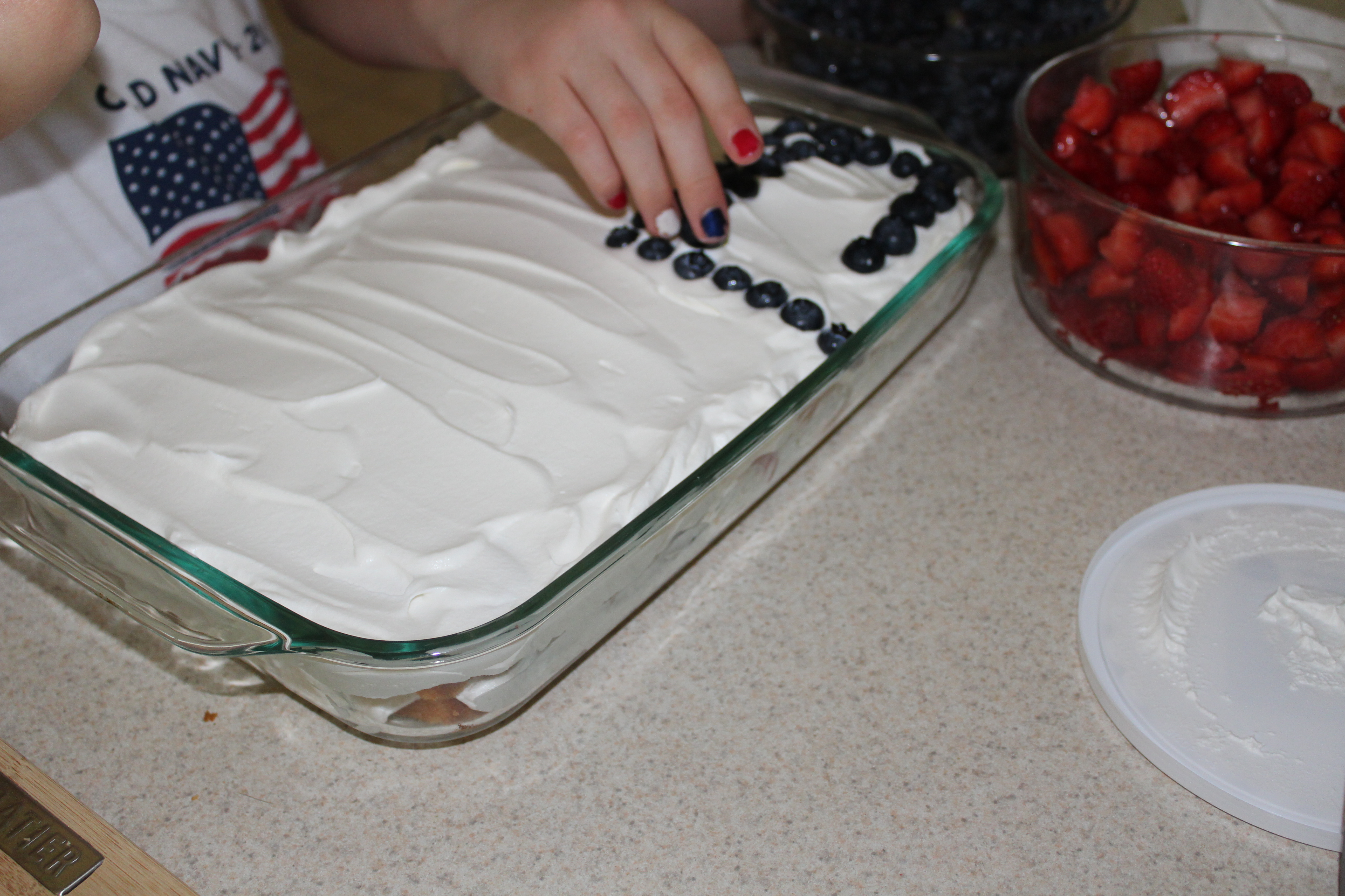 This is where it is good to add in kid helpers.  Place your strawberry chunks and blueberries all over the top of the whipped topping. It will look like the picture below when you have enough.