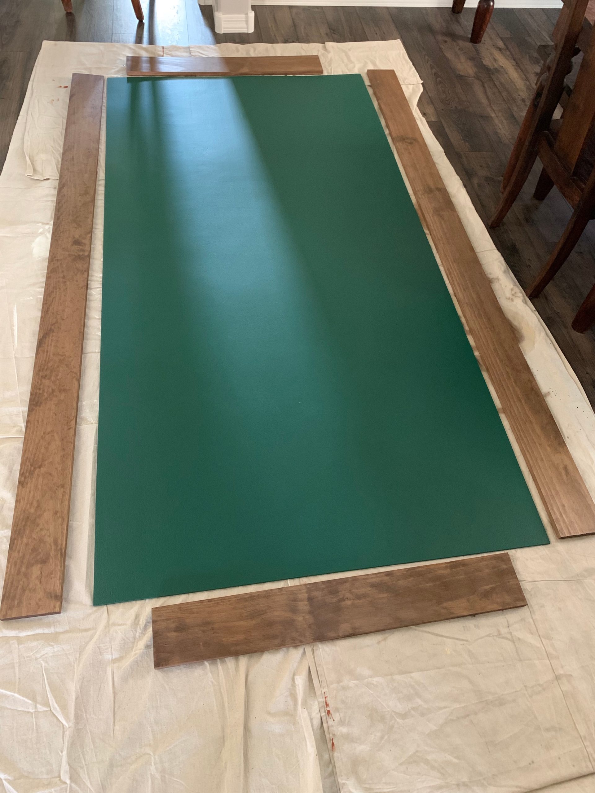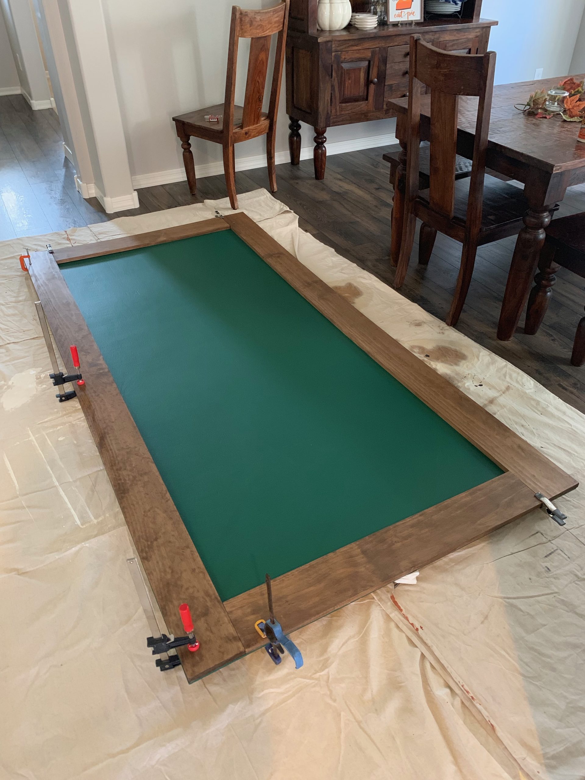 Because I had so long to think this over we decided to make a few changes from our downstairs chalkboard.  For this one we decided to paint the chalkboard on birch plywood so it could be hung on the wall, verses paint right on the wall like we did downstairs.  We sanded the wall downstairs before painting but it was still hard to get rid of the wall texture.  Also for this one we chose to not use angle cuts on the outside boards and stain them instead of painting them white.  I love the farmhouse rustic feel with this one and it was so much easier than having to match up exact angels and fill in seems.  The color choice for this one was actually something done more last minute.  I had originally assumed we would paint it black, but being in the playroom we decided to go with green to keep it more light and bright!  And my 3 youngest really wanted green! 🙂
