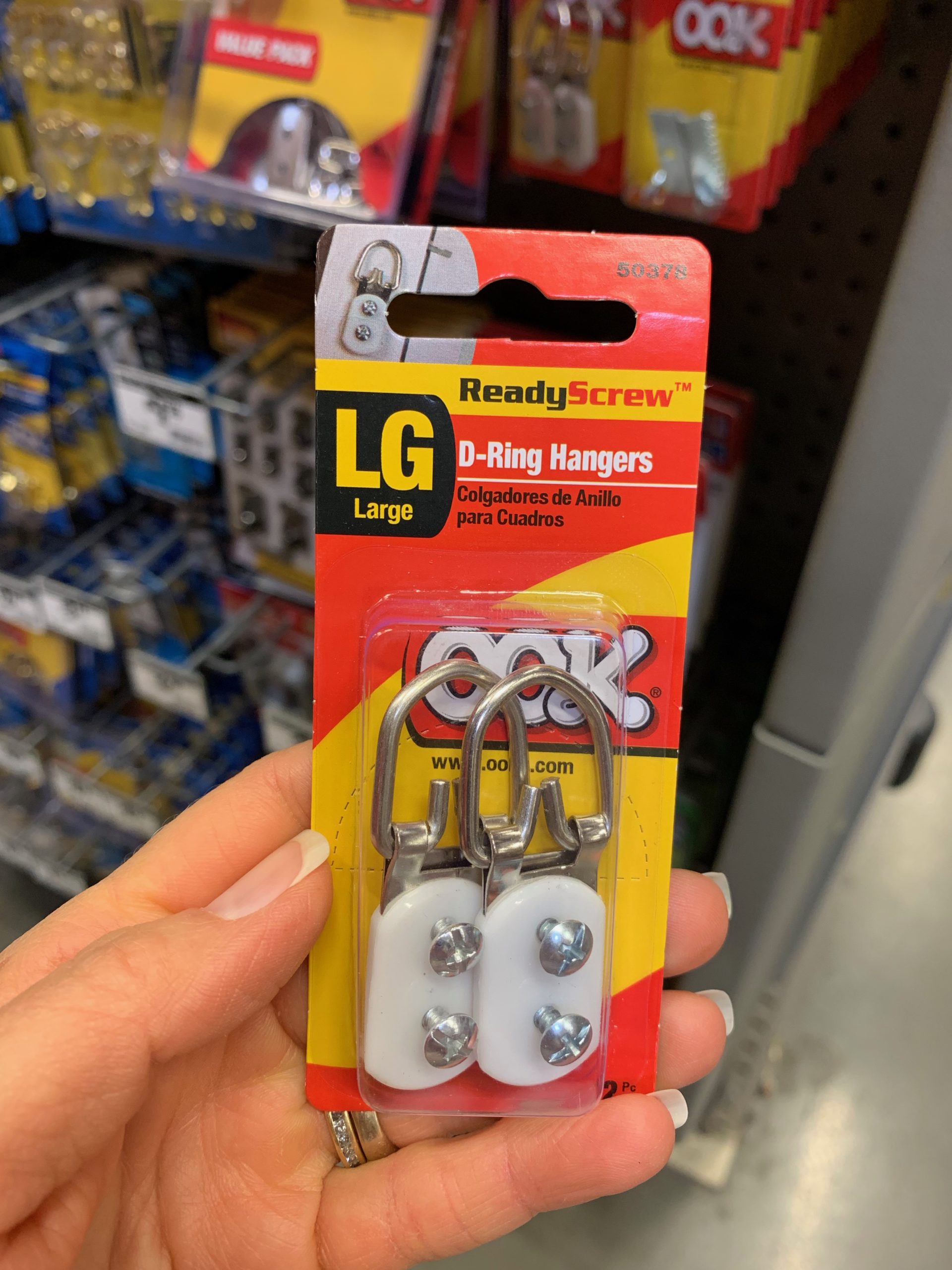 Then we lugged this upstairs, it took 3 of us!  We centered it to where we wanted and then my husband found where the studs were and we matched that up to where we needed to add the hangers on the back of the board.  We found these D Ring hangers at Home Depot and they worked great.  Then he screwed those in place.
