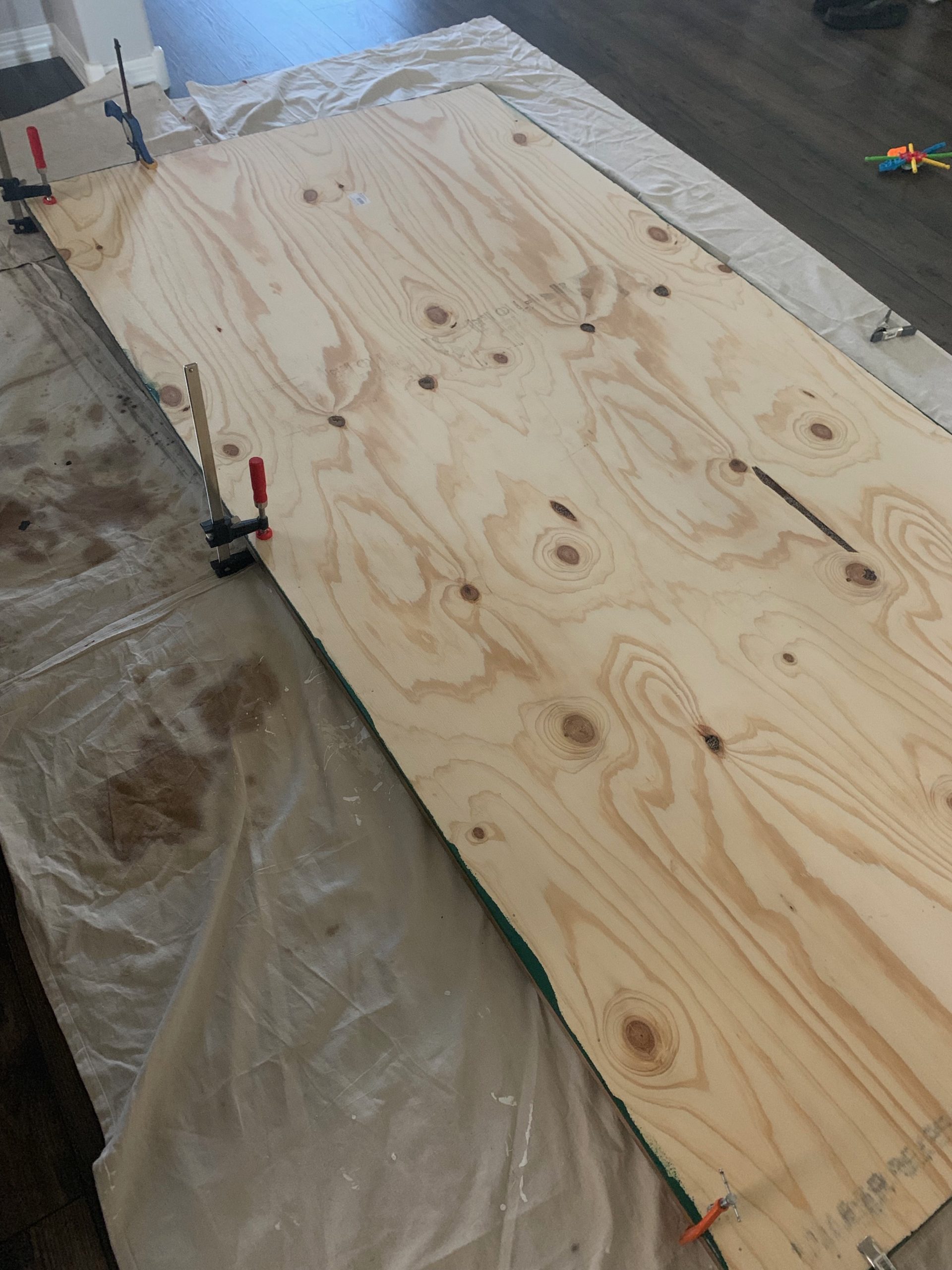 We let it dry overnight and then we took wood glue and glued on the side boards.  Some of the boards were a little warped so my husband used clamps to keep the boards flat on the plywood while it dried.