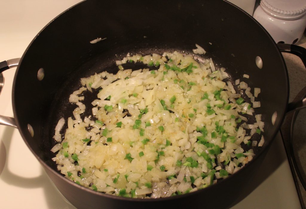 Next, over medium heat pour 3-4 tablespoons olive oil into a large dutch oven or pot.  Add in your chopped onion and jalapeño and stir around. Cook until tender.